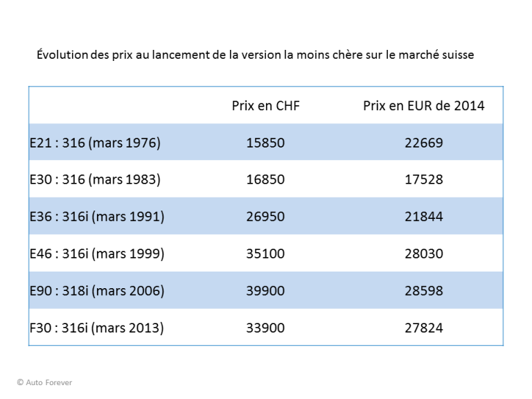 Nous allons donc comparé les prix au lancement de chaque nouvelle génération de la version de la moins chère et les prix en fin de carrière de la version haut de gamme. Nous utilisons les prix du marché suisse exprimés en francs suisse. Nous faisons ce choix pour deux raisons. D’une part, la monnaie helvétique est un des monnaies les plus stables et les plus fortes au monde depuis des décennies. D’autre part, le marché automobile suisse est neutre, car sans constructeurs nationaux, et donc plus concurrentiel et atomisé que les autres marchés. Pour pouvoir obtenir avoir des références avec les prix actuels, nous avons converti les prix en francs suisse en prix en euros constants de 2014. Cela signifie que le prix en euro de la 316 E21 de 1976 est en tout point comparable au prix de la 316d F30 de 2013.