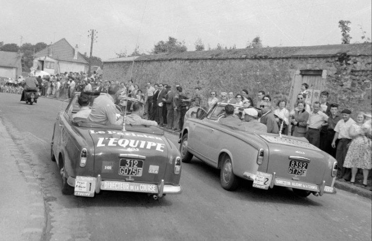 Au cours des années 1950, nous trouvons sur les routes du Tour un peu tous les modèles des constructeurs français de l’époque. Ainsi la Renault Dauphine, les breaks Peugeot 203 et Simca Marly, les cabriolets Peugeot 403 et Simca Océane ont fait partie des suiveuses de la course.